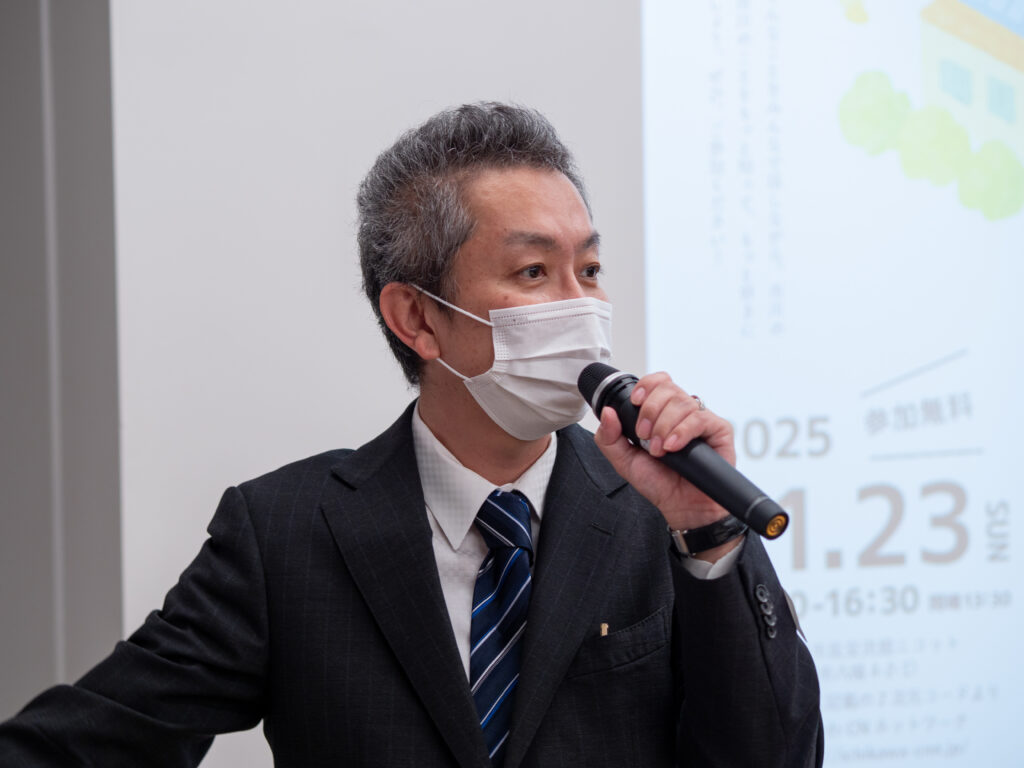 市川市カーボンニュートラル推進局の高濱伸昭さんより開会のご挨拶でスタートしました。市川市が主催で行うアシタノイチカワは、「いちかわカーボンニュートラルプロジェクト」という位置付けで開催していることの説明があり、市川の未来についてみんなで考え、持続可能なまちづくりについて、住まいの視点で考える機会となればとお話しされました。