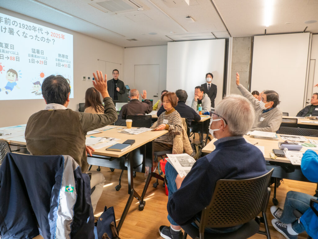 前さんは参加者に各問題について問いかけ、多くの参加者が冬の寒さや夏の暑さ、電気代・ガス代の高さに不満を持っていることを確認しました。